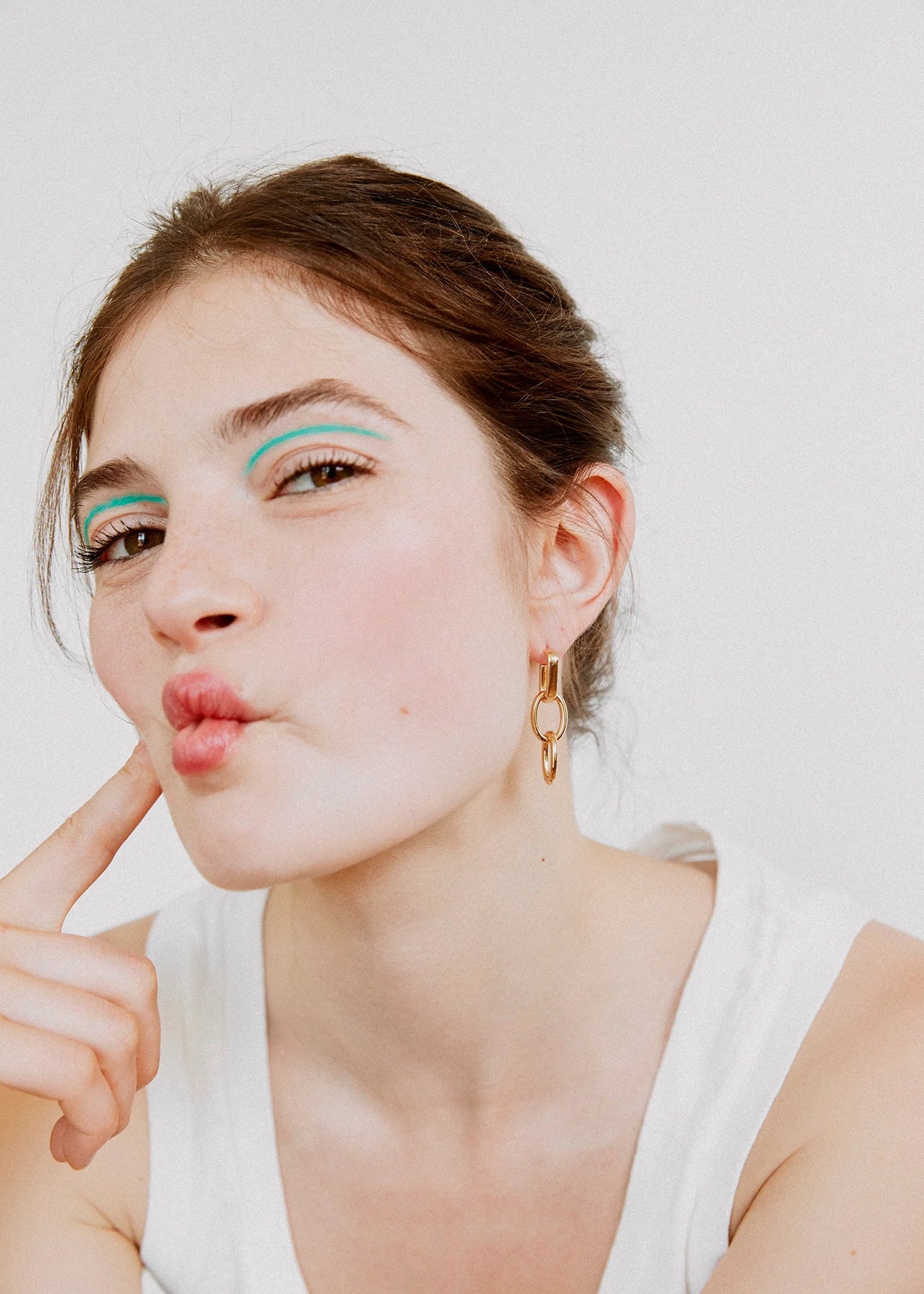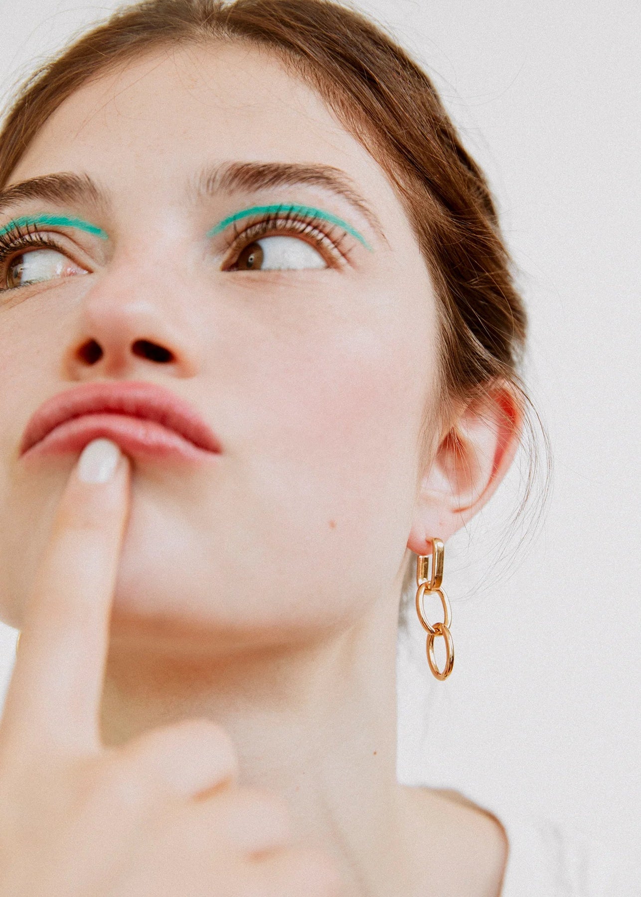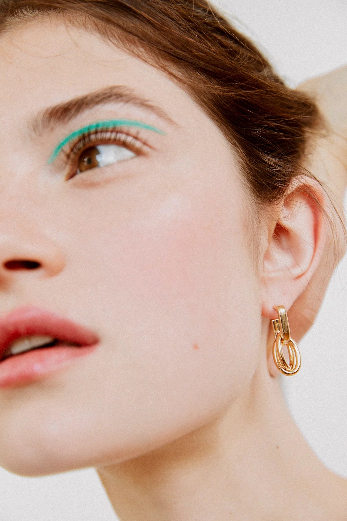 両耳ともにリングを縦に揺れるように通せば、軽やかでエレガントに。