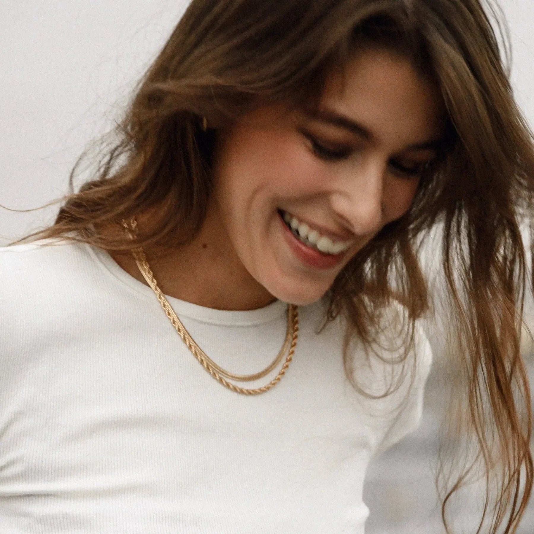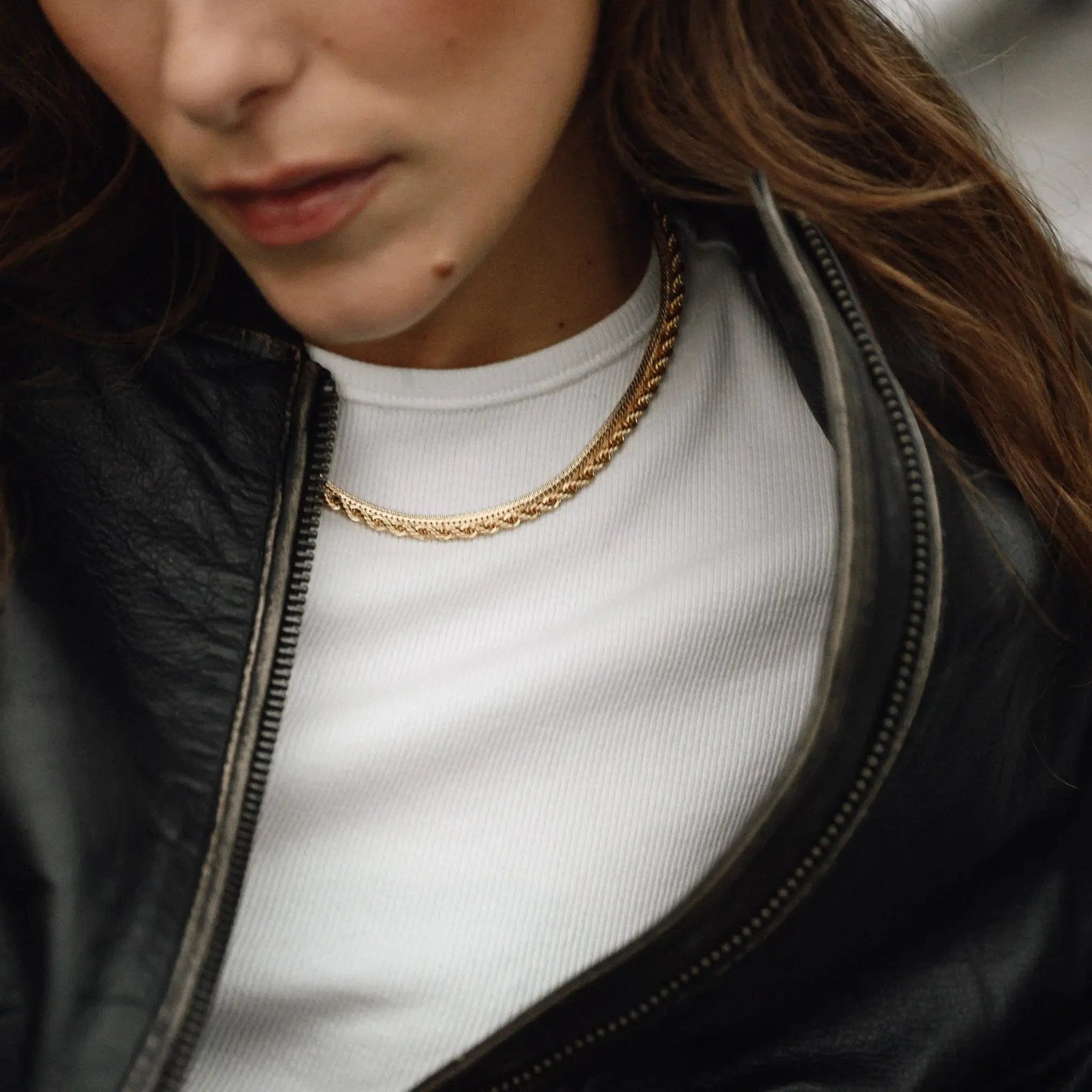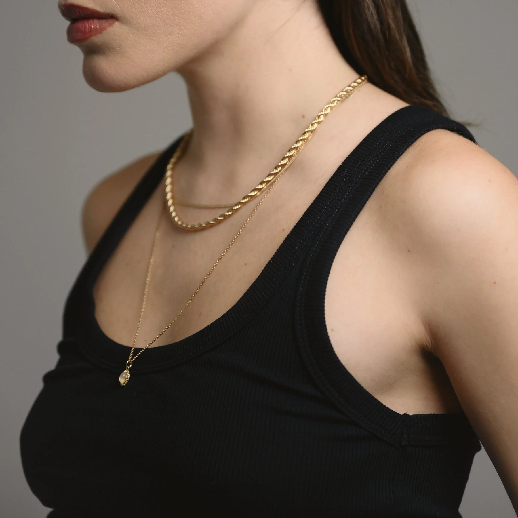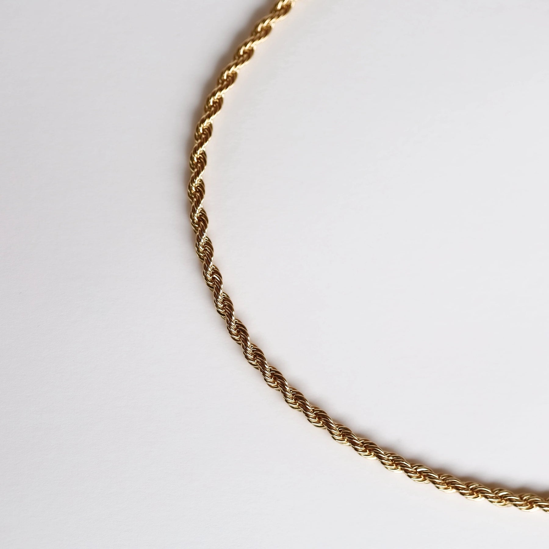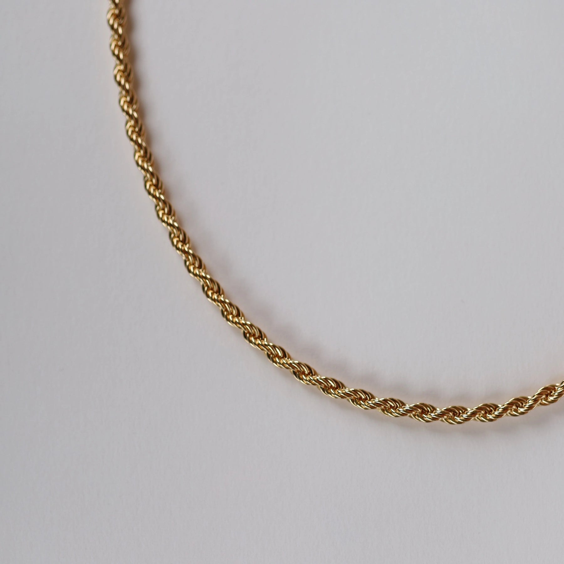 繊細にねじられたチェーンが生み出す立体感と、18Kゴールドのつややかな輝きが際立つネックレス。