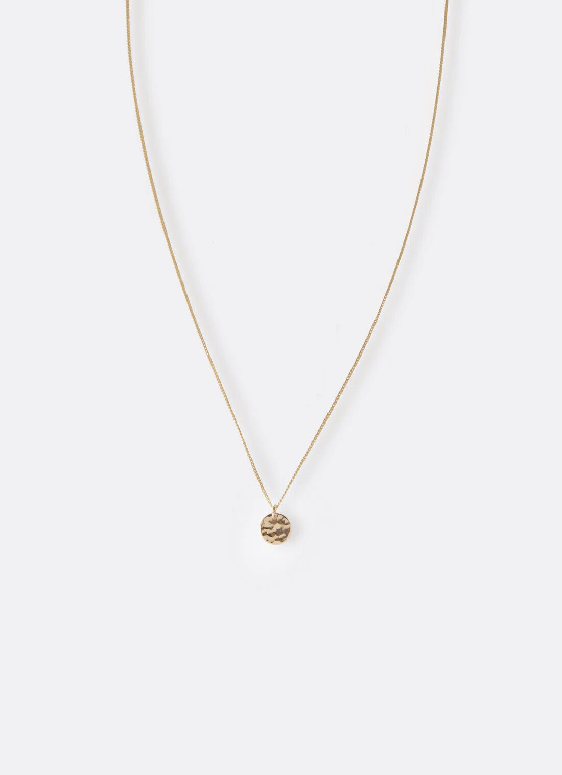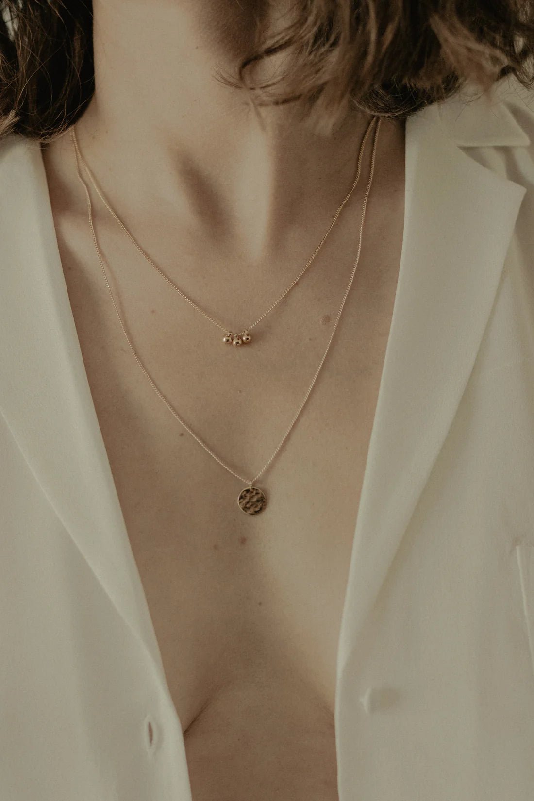 ゴールドカラーの細いチェーンに、手作業で槌目加工を施したチャームがアクセントとなり、光の角度によってさりげなく輝きを放ちます。